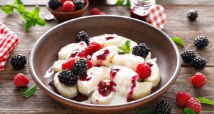Ingrediente 400 g brânză de vaci 4 linguri făină 4 linguri zahăr 1 linguriță coajă rasă de lămâie 1 ou 1 linguriță extract de vanilie 150 g fructe de pădure 1 linguriță unt 1 praf de sare smântână și fructe ...
