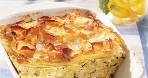 Ingrediente 500 g cartofi; 1 varză mică; sare; piper alb; 50 g unt; 3 ouă; 250 g ricotta; 2 linguri unt topit pentru stropit; unt și făină pentru tapetat vasul Mod de preparare Speli cartofii și-i pui la fiert în ...