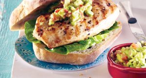 Ingrediente 2 bucăți avocado; 1 lime; 1 cățel usturoi; 1 roșie; 1 ceapă mică roșie sau alba; sare; piper măcinat; 4 bucăți piept de pui mai mic; 1 lămâie; ulei de măsline; 4 bucăți ciabatta; 4 frunze de salată Mod ...