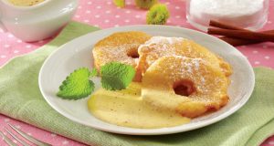 Ingrediente 3 mere 2 linguri zeamă de lămâie PENTRU ALUAT: 150 ml lapte 2 ouă 200 g făină sare ulei pentru prăjit PENTRU SOS: 4 gălbenușuri 40 g zahăr pudră 200 ml smântână pentru frișcă 1 linguriță scorțișoară măcinată Mod ...