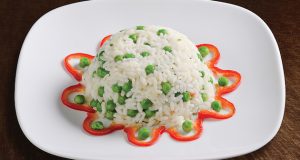 de la 8 luni/2 porții Ingrediente 1 1/2 cești apă 1/2 ceașcă orez 1 ceașcă mazăre verde ¼ ceapă mică ¼ ardei gras roșu mic fiert pentru decor 2 lingurițe unt Mod de preparare Pui apa la fiert într-o crăticioară ...