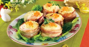 Ingrediente 4 fileuri de somon; 1 lămâie; 3 căței usturoi; 2 lingurițe condimente de pește; sare; 100 g făină; 8 felii de pancetta sau de bacon; 3 linguri ulei de măsline; 200 g brânză topită rotundă; frunze de salată; 1 ...