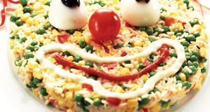 Ingrediente 250 g orez 200 g mazăre congelată 200 g boabe de porumb conservate 1 ardei roşu 5 linguri ulei de măsline 2 linguri zeamă de lămâie sare Pentru decor 1 ou 1 roşie cherry 2 cepe roşii 2 măsline ...