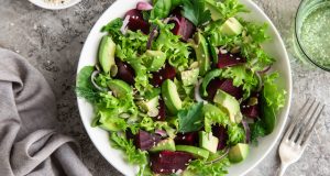 Ingrediente 400 g mix de salată verde 1 sfeclă roșie mică fiartă 2 avocado 1 ceapă roșie medie 1 linguriță semințe de susan 2 lingurițe miez semințe de dovleac câteva fire de mărar Pentru dressing ½ linguriță muștar 3 linguri ...