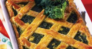 Ingrediente 700 g frunze proaspete de spanac 200 g ceapă verde 3 căței usturoi 100 g unt 150 g brânză Edam rasă 150 ml smântână 500 g aluat de patiserie 4 ouă sare un gălbenuș pentru uns Mod de preparare ...