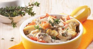 Ingrediente 600 g pulpă de vițel 1 ceapă medie 2 căței de usturoi 2 linguri ulei 8 ciuperci champignon 50 g șuncă sare piper ¼ linguriță cimbru uscat 100 ml vin alb 120 ml smântână dulce de gătit Mod de ...