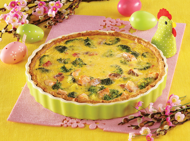 Bați ouăle și le amesteci cu smântâna, cașcavalul ras și pătrunjelul tocat. Condimentezi cu sare și piper. Împarți bucățile de somon și buchețelele de somon în formă, torni compoziția de smântână și o introduci în cuptorul încins 140°C pentru 30 de minute. O lași să se răcească și o servești.