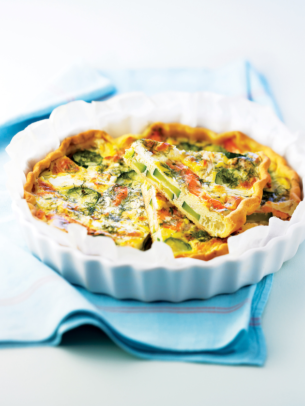 Speli dovlecelul, îl tai felii potrivite şi le fierbi la aburi 10 minute. Somonul îl speli şi îl tai fâşii. Pui hârtie de copt într-o formă de tartă, întinzi o foaie din aluat, o aşezi în formă şi înţepi aluatul cu furculiţa. Pui peste aluat, alternând, feliile de dovlecel şi fâşiile de somon.