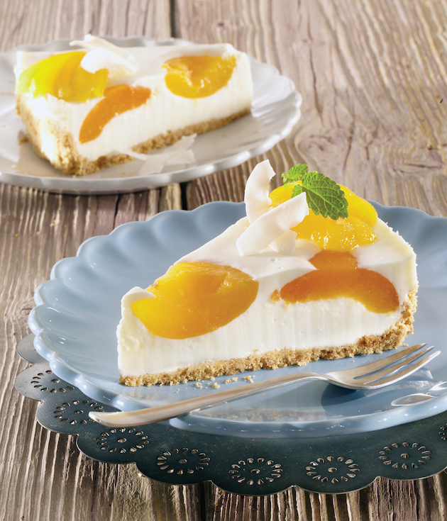 Aşezi felii de caise în forma de tartă şi torni peste ele crema de iaurt. O introduci în frigider peste noapte. O tai felii, le decorezi cu câte o bucată de caise şi fulgi de nucă de cocos.
