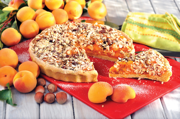 Amesteci semințele cu alunele tocate mărunt, cu fulgii de ovăz, mierea, stafidele și o lingură suc de portocale. Umpli tarta cu caisele, presari amestecul de semințe cu fulgi și o introduci la cuptor pentru 15 minute la 180 ° C. O servești caldă sau rece.