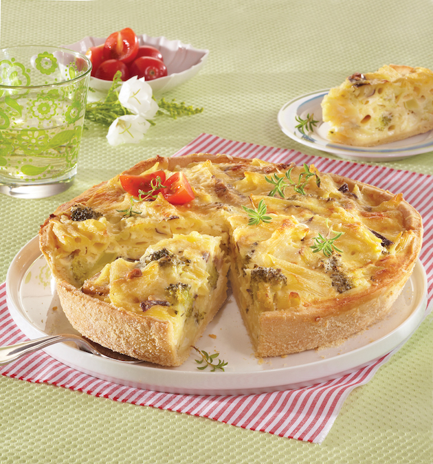 Fierbi pastele în apă cu sare conform indicațiilor de pe ambalaj. Le scurgi, iar în apa în care au fiert, pui buchețelele de broccoli și le fierbi 5 minute. Le scurgi și le pui peste paste. Ciupercile le tai felii, le sotezi 5 minute în unt și le pui peste paste împreună cu baconul tăiat bucăți. Adaugi la final brânza de vaci cu ouăle, sare, piper și cașcavalul ras. Omogenizezi compoziția și o torni în forma de tartă. O introduci în cuptorul încins la 175°C timp de 40 minute.