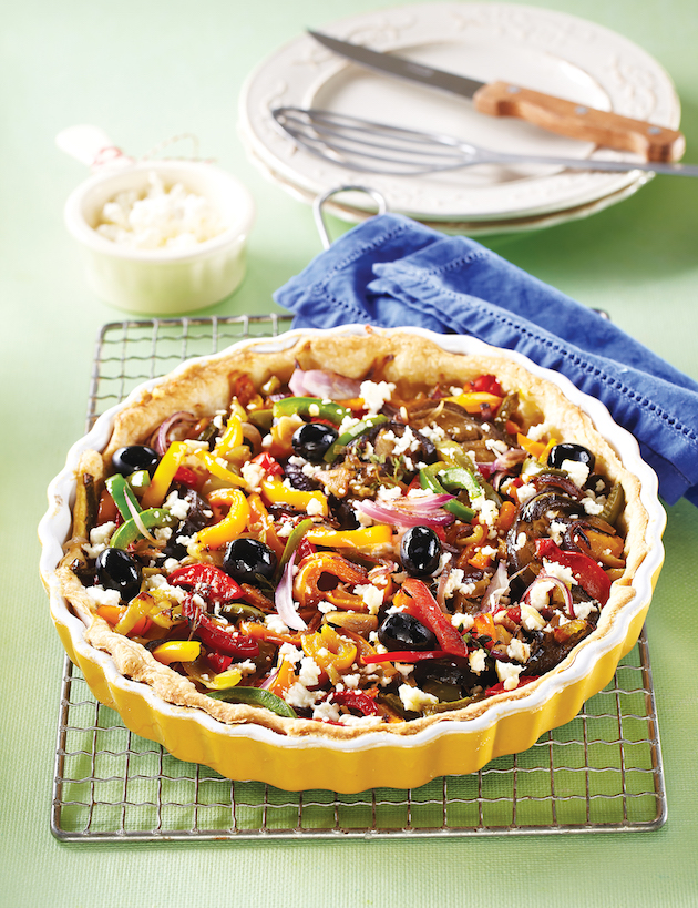 Întinzi aluatul de tartă în formă rotundă și îmbraci cu el o formă de tartă. Apeși bine pe margini și îl înțepi din loc în loc cu furculița. Pui compoziția de legume, presari deasupra brânza feta sfărâmată și măslinele. Introduci tarta în cuptorul încălzit la 200°C timp de 30 de minute. O servești caldă, dar este le fel de bună și rece.