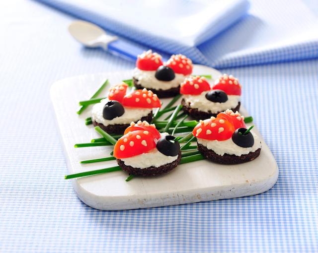 Tai feliile de pâine neagră cu o formă rotundă și întinzi deasupra cremă de brânză. Formezi capul buburuzei dintr-o jumătate de măslină, iar aripile din sferturi de roșie. Pui smântâna într-un poș și formezi pe roșie punctulețe mici (ca în imagine).