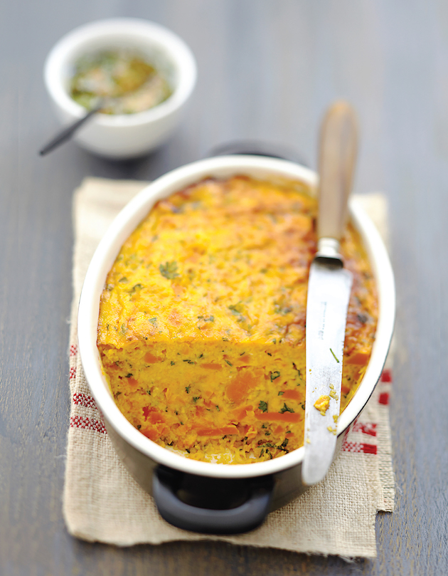 Torni piureul într-un castron, adaugi morcovii opriți tăiați bucăți, puțină sare și piper și omogenizezi. Torni compoziția într-un vas termorezistent uns cu unt, îl așezi în alt vas mai mare în care ai pus apă și îl introduci în cuptorul preîncălzit la 180º C pentru 50 de minute.