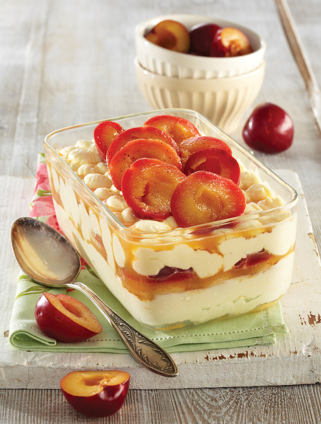Așezi pe fundul unui vas de sticlă pișcoturi, le stropești cu cafea și pui jumătate din cremă. Acoperi cu pișcoturi, le stropești cu cafea și întinzi și 3/4 din prune. Cu un poș acoperi cu crema rămasă și introduci vasul la frigider cel puțin 3 ore. Înainte de servire pui deasupra prunele rămase.