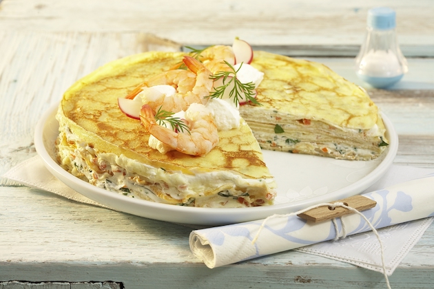 Ornezi tortul de clătite cu crema de brânză și creveții opriți trași puțin în unt. Îl lași la rece cel puțin o oră.