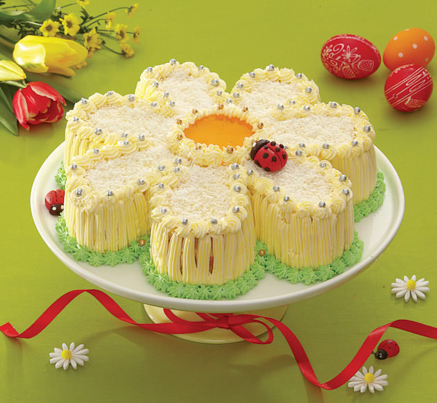 Scoți tortul din frigider, îl ungi cu a treia parte de cremă și îl presari cu nucă de cocos. Crema rămasă o pui într-un poș și îl decorezi ca în imagine. În mijloc pui gemul de caise și-l dai la rece să se întărească crema. Îl decorezi cu perle aurii și argintii și buburuza de marțipan.