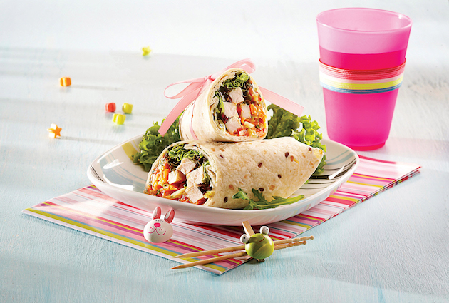 Încălzești bucățile de tortilla 10 secunde în cuptorul cu microunde, așezi pe ele carne, legume și frunze de salată, condimentezi cu sare, rulezi cât mai strâns și le servești.