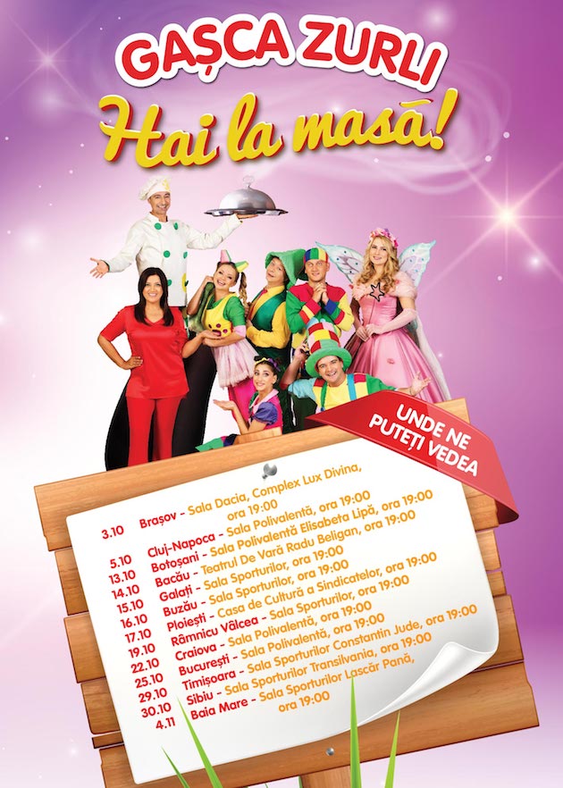 Iar asta nu este tot, azi s-au pus în vânzare și biletele pentru spectacolul din Sibiu, din 30 octombrie, de la Sala Sporturilor Transilvania. Astfel, turneul Gașca Zurli – “Hai la masă!” adună 13 orașe! Facem o scurtă recapitulare a acestora: